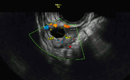 Image of an antral follicle count ultrasound — an ovary showing 3 follicles (highlighted in red and yellow).